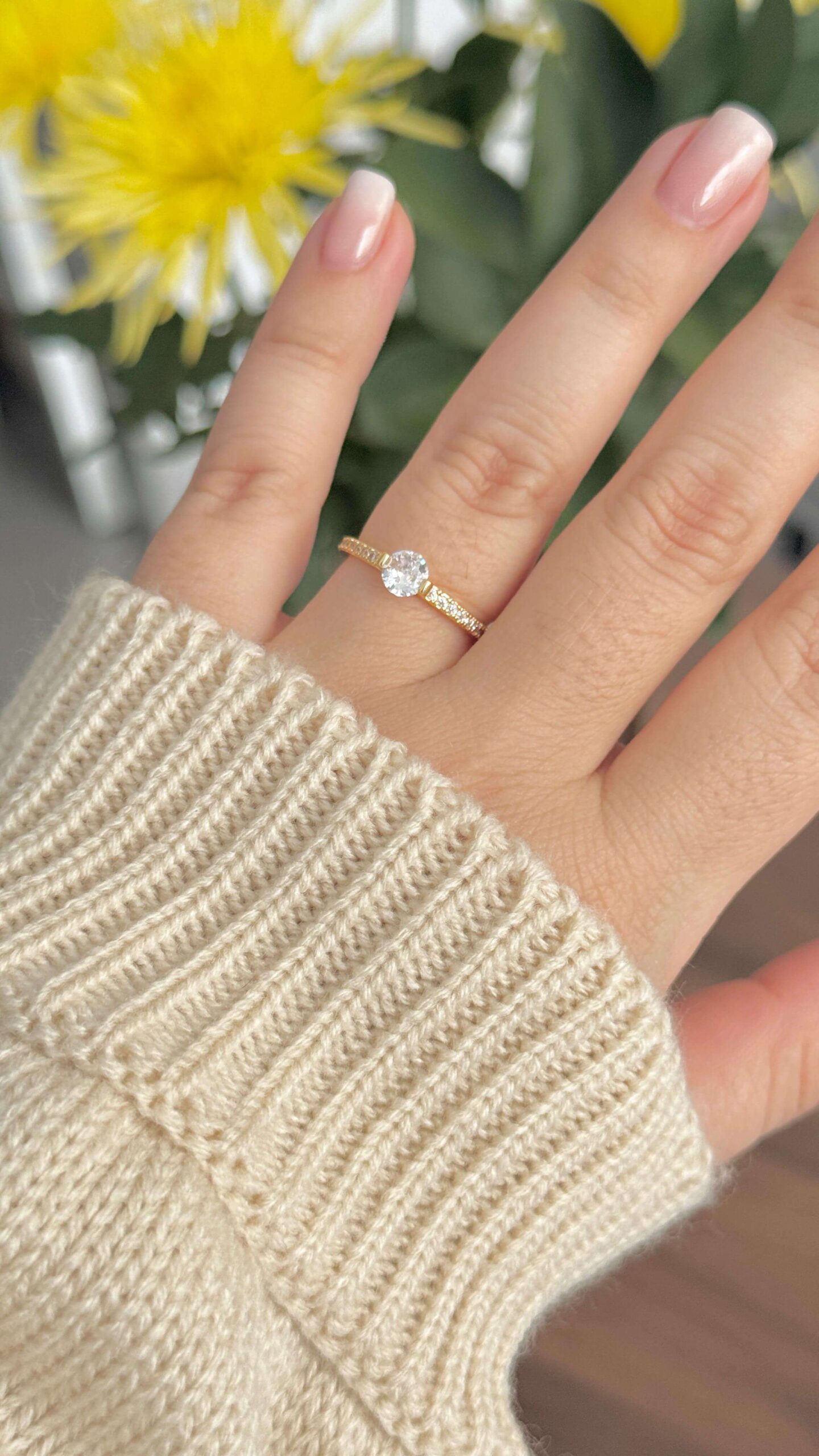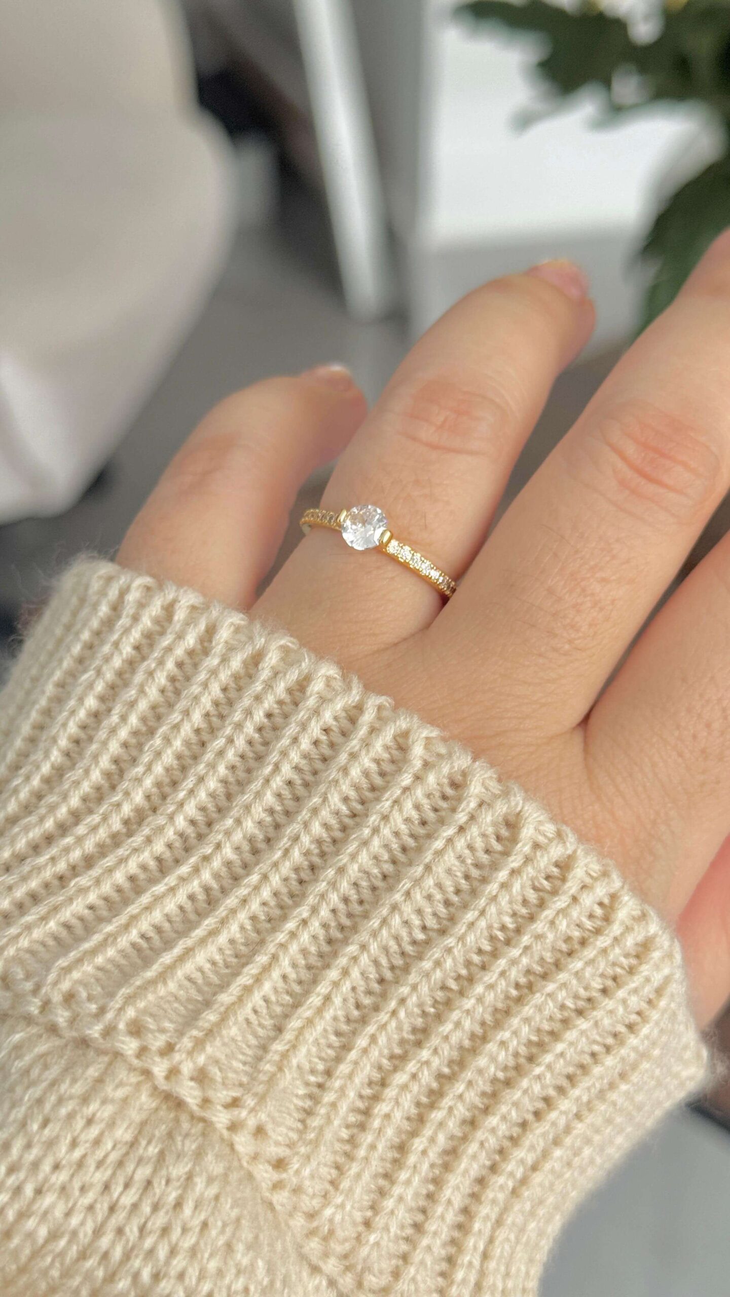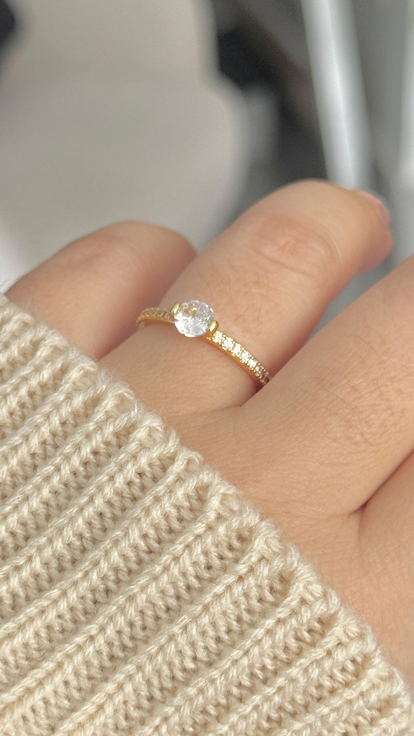Nuestro anillo es la definicion de minimalismo y feminidad. Con un circon brillante central acompañado por una fila de delicados cristales que realzan su diseño. Ideal para compromisos